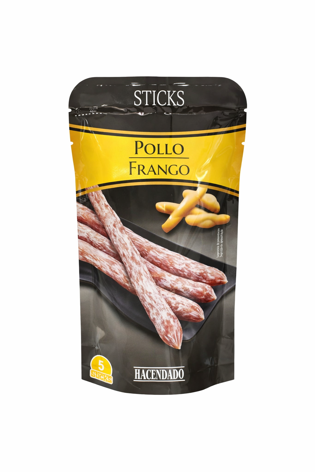 Pollo Frango Sticks от Hacendado — это удобная мясная закуска в формате мини-стиков, приготовленная из куриного мяса с добавлением специй. Благодаря технологии сыровяления продукт приобретает насыщенный аромат, плотную текстуру и характерный вкус испанских мясных деликатесов.